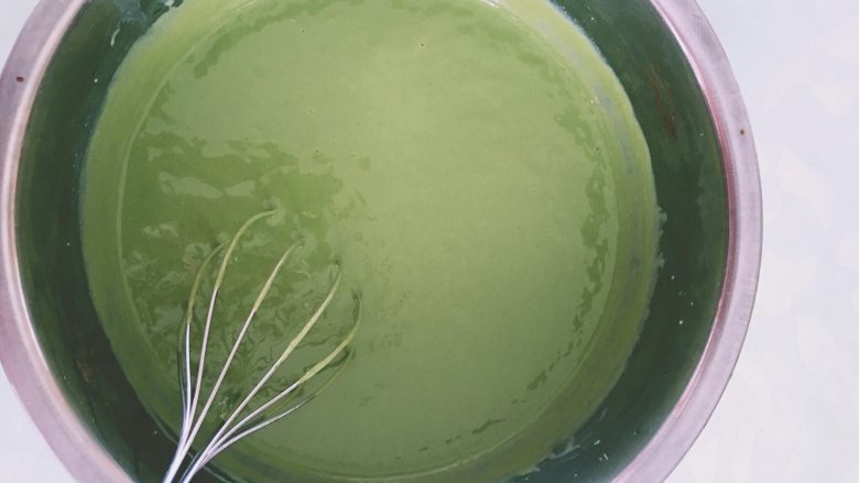 6. 牛奶溶液分5-6次加入抹茶砂糖中,每次都用打蛋器不停的搅拌均匀,直到细砂糖完全融化,将吉利丁液加入其中搅拌均匀