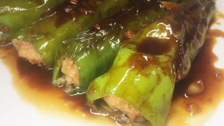 4. 肉馅塞到尖椒里,不要塞的太满。