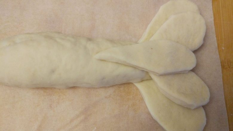 4. 制作尾部:另取一块,擀成薄片,按照图片切出尾部,将部位按顺序叠放好,中间用少许蛋液粘合