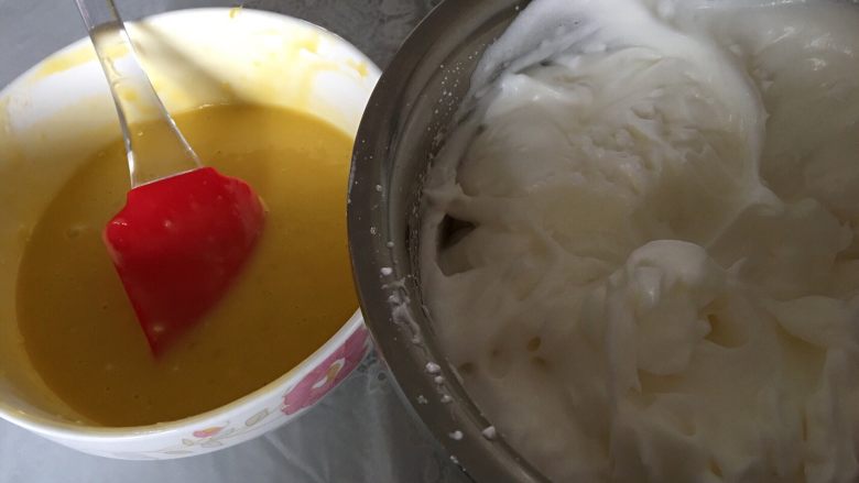 13. 打发好的蛋白和搅拌均匀的蛋黄液。