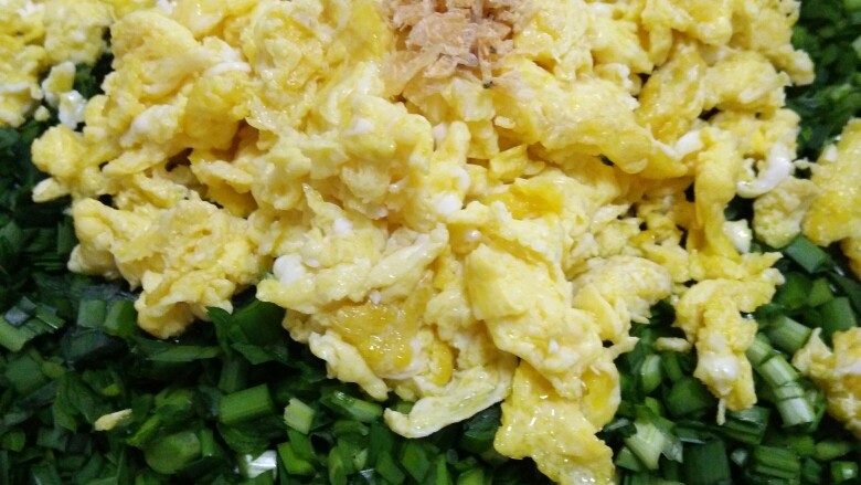 7. 将切好的韭菜、虾皮和晾凉的鸡蛋碎放入盆中。