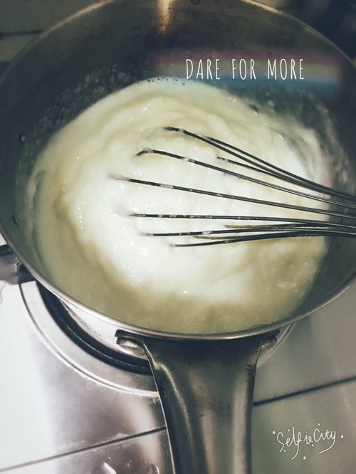 7. 煮沸后立即加入之前搅拌好的牛奶淀粉液,快速搅拌好成糊状
