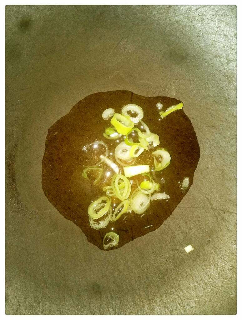 3. 锅底倒少许油,放少许花椒面,葱花。炝出香味,倒入拌菜里。