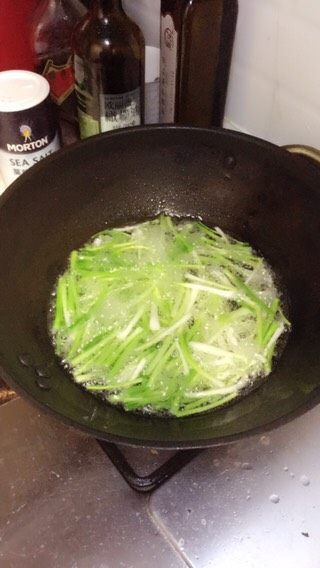 4. 煎至小葱变色,直至小葱的水分炸干,颜色变黄即可。