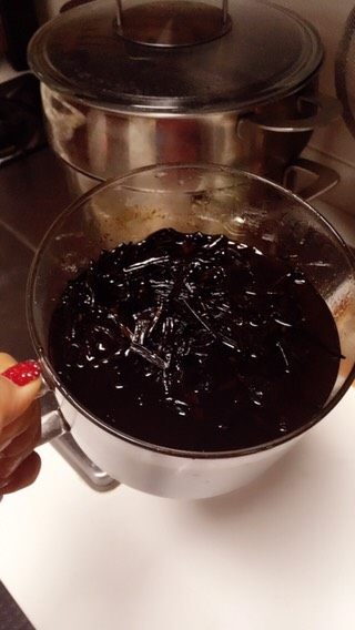 7. 将刚刚炸好葱的葱油充分利用,先加入白砂糖,微微炒至起泡,然后倒入生抽,老抽,加入一点点海盐熬浆,然后将炸好的葱倒入锅内。最后加入一点开水,小火慢熬大约15分钟,收干水份。