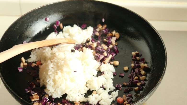 - 2、不太容易熟的紫甘蓝和香菇先炒一下,和别的蔬菜口感保持一致。