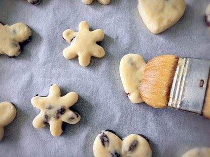 6. 撒手粉(高筋面粉)防粘,擀平至1-1.5cm厚。模具沾手粉后再切,有葡萄干的的地方需要稍微用力按切模。