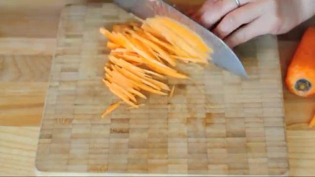3. 起锅热油,倒入蒜蓉爆香,下牛蒡丝翻炒,出香味后倒入胡萝卜丝