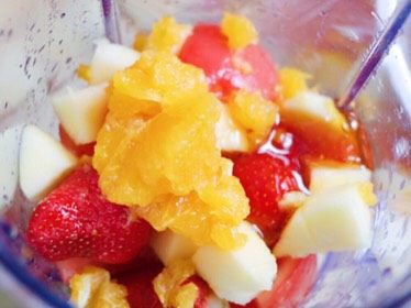3. 番茄切块,草莓切块放入料理机中