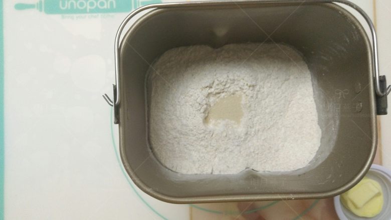 7. 除黄油外的材料放入面包桶,启动揉面程序,揉成团后加入黄油。