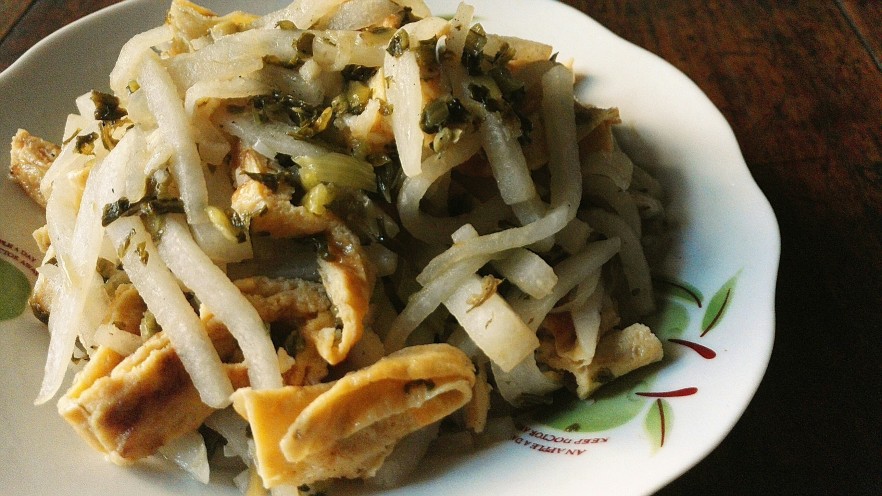 4. 1.热锅,倒油。冒烟后转至中火,倒入白萝卜丝,翻炒两遍,确保受热均匀。2.随后倒入雪菜,继续翻炒。3.加入少量冷水,盖上锅盖,闷四十秒左右,开盖。4.加少量盐、鸡精、白糖调味,倒入切好的鸭蛋条,继续翻炒一分钟左右,就可以出锅了。