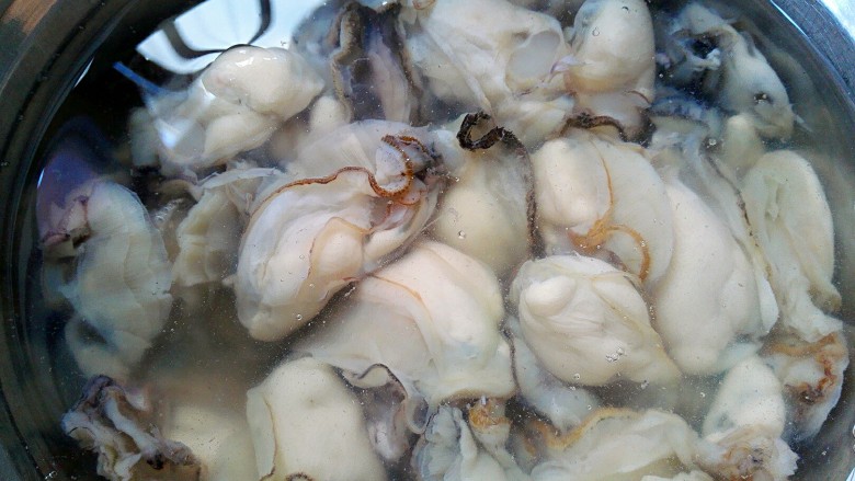 3. 烧开水倒入清洗干净的海蛎子焯水10秒就可以了,(不但去腥,也会去掉脏东西)时间不宜久,海蛎子会缩小影响口感。