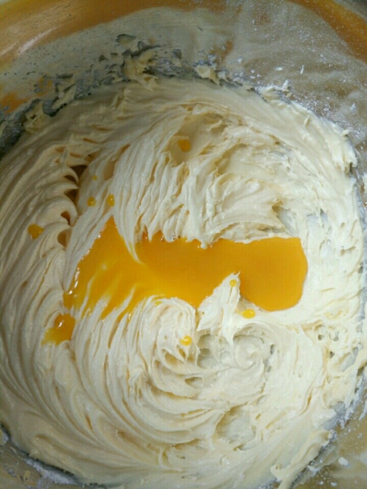 3. 鸡蛋液分三次加入,和黄油打发均匀
