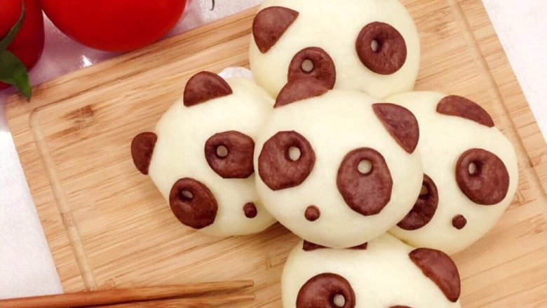 6. 将小圆片从中间一分为二做成半圆形的熊猫耳朵 再拿一个小圆片用吸管戳一个小孔 小孔可做鼻子 再将小圆片轻轻拉成椭圆形 做成熊猫的眼睛 用包包子的手法包入调好的红糖馅儿 收口朝下摆放 做好的熊猫眼睛耳朵鼻子固定在包子上 如固定不牢可以沾少许清水就很容易固定住啦