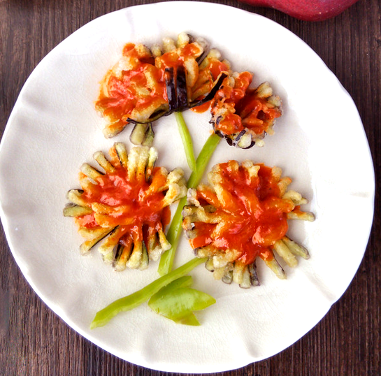 8. 炸好的茄子摆盘 故意炸了一朵稍小的花苞状,另一朵炸成稍侧向,摆盘感觉更立体一些 还是那句话,茄子太细,立体效果不够啊