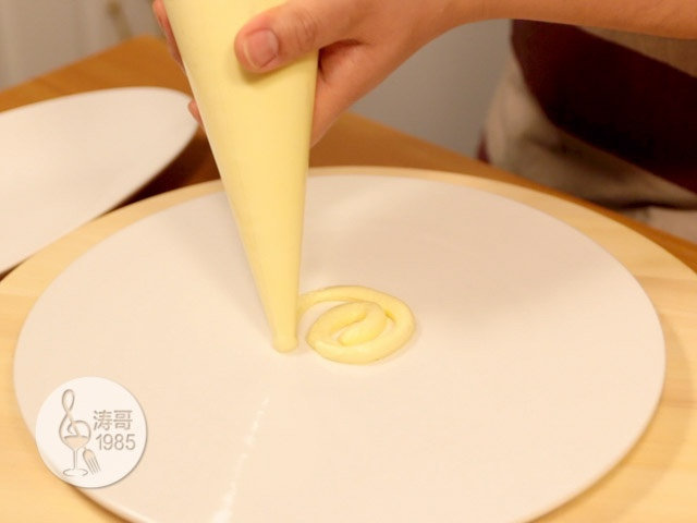1. 先在一个平面圆盘中心挤一点瑞士奶油霜