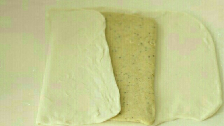 6. 在左右两边对折,一半皮压在另一半上,这样就叫3折。静置10分钟。一共做3折3次,每次都静置10分钟。