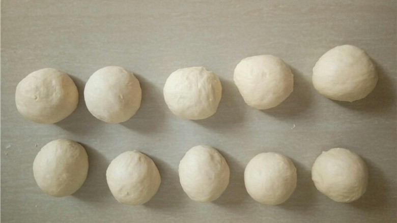 14. 发酵结束,将面团分成10个小面团滚圆,盖上保鲜膜松弛15分钟。