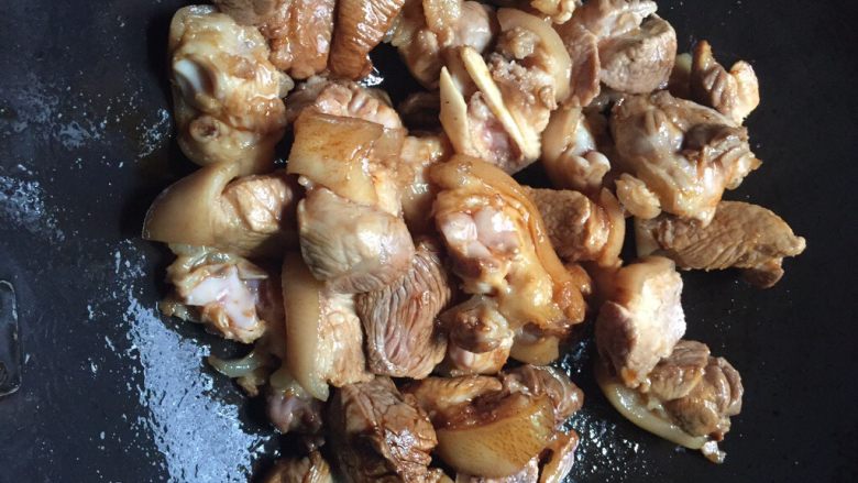 5. 炒好的糖,直接把猪蹄放进去翻炒,炒到每个颜色都差不多,如果觉得不红的话适当加点老抽酱油