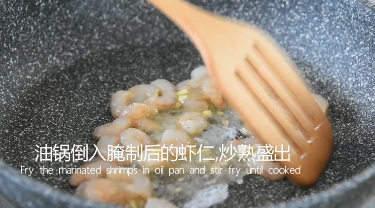 5. 油锅倒入腌制后的虾仁,炒熟盛出