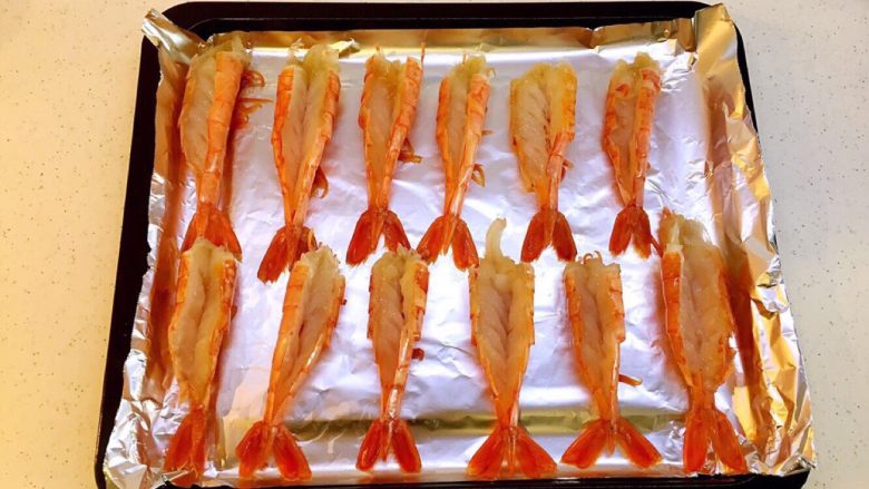 6. 第二步 摆入烤盘 烤盘中铺好锡纸,使红虾可以很平整的摆放在烤盘中,注意摆放的时候,要把尾巴张开,这样放得更平稳。