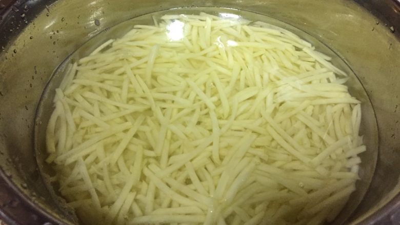 2. 削成丝,我用工具完成,浸泡下,洗去过多的淀粉;