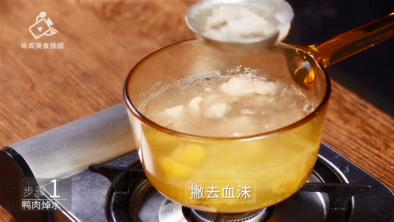 2. 250克鸭肉入清水,煮沸后撇去浮沫