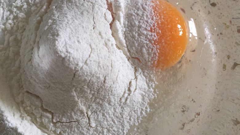 5. 舀一勺蛋糊液倒平底锅中。有大泡起一分钟左右。