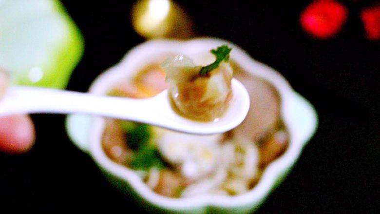 13. 煮熟的肉燕馄饨和面条盛入碗中……