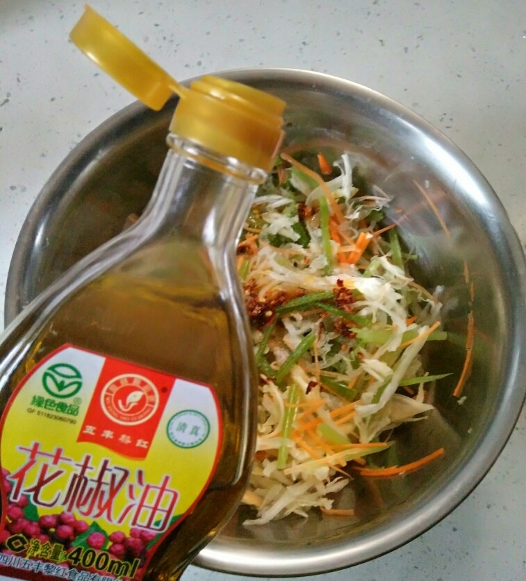 11. 腌好的白菜丝加入凉水,再用手攥净水分(除去白菜生味)。