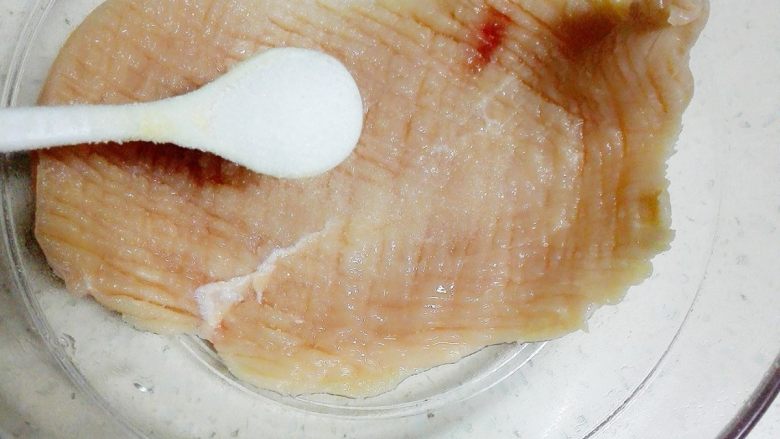 4. 将放松好的两块鸡胸肉放入料理碗中,加入1茶匙盐,抹匀