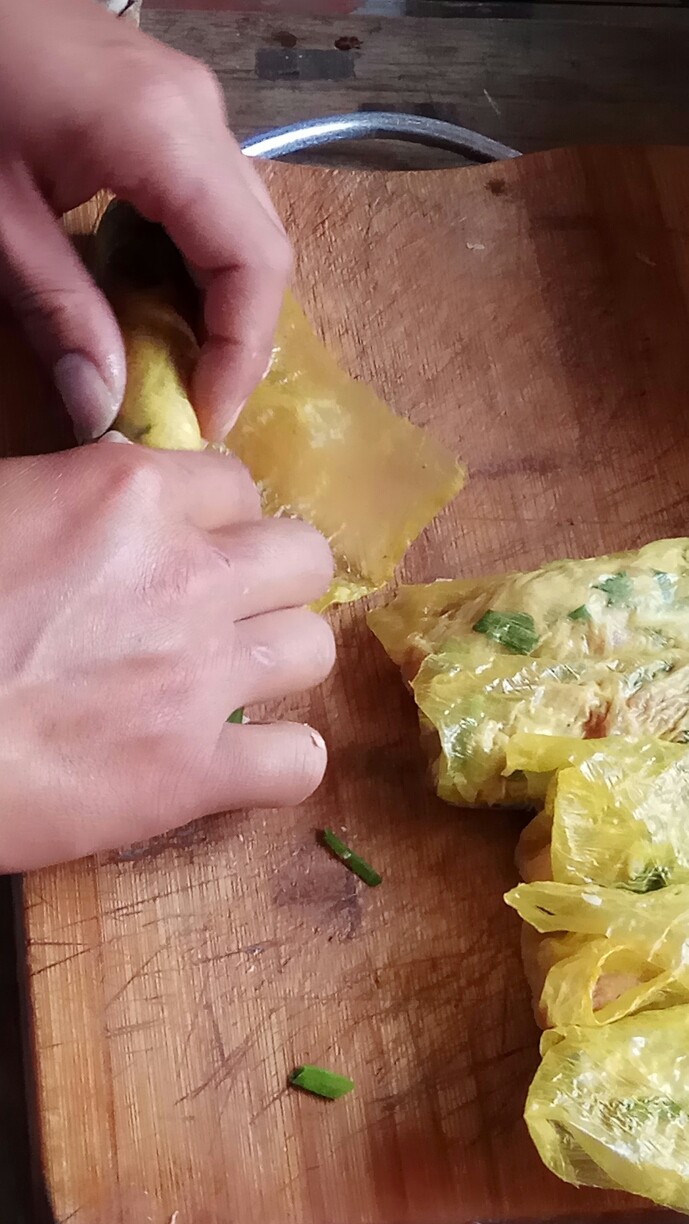 3. 将豆腐皮和肉,抱起来,卷成团。把肉放豆腐皮中间,两角折入,再卷成团