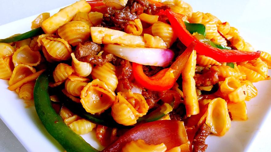 9. 色香味俱全的牛柳双椒贝壳面出锅了!