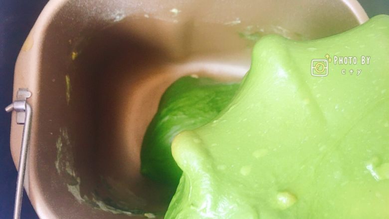 2. 将纯牛奶、鸡蛋、盐、细砂糖、奶粉、蛋糕粉、面包粉、抹茶粉、干酵母依次倒入面包机桶内,和面12分钟。