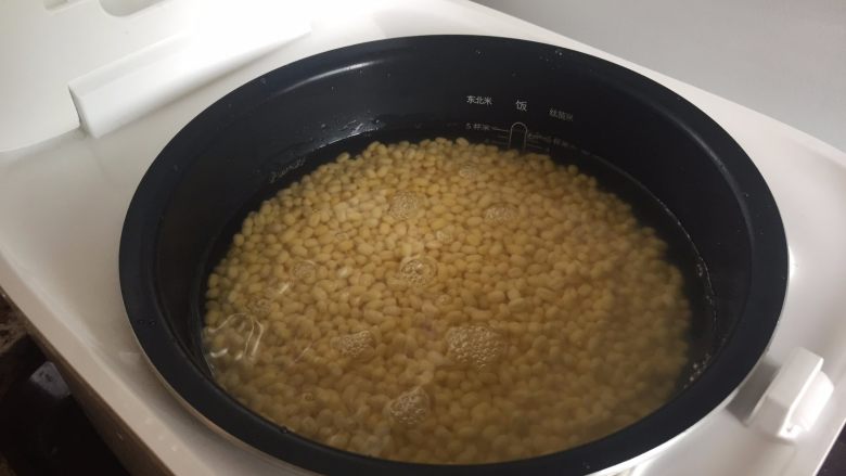 2. 一晚上的浸泡,绿豆,已经泡发了,泡发的绿豆,放入电饭煲内胆中;