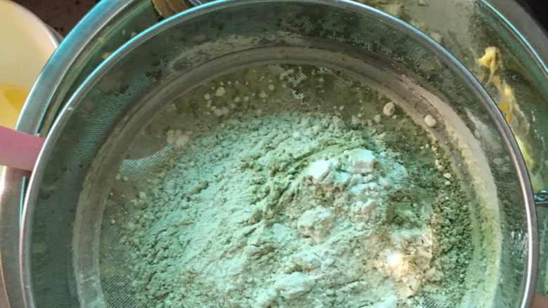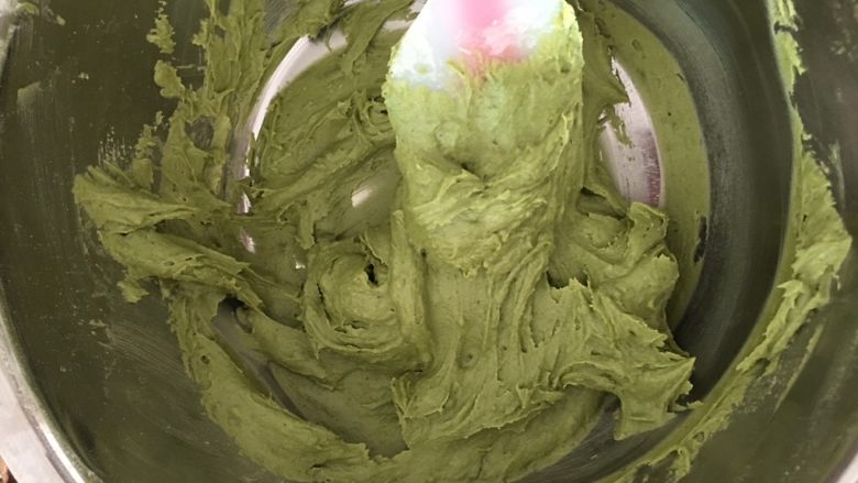 6. 把刚刚混合好的面粉过塞加到打发好的黄油中