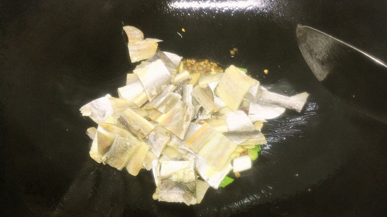 4. 倒入洗净切好的小鲨鱼进行煸炒