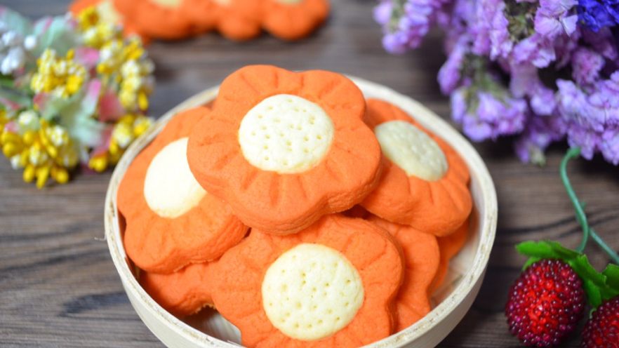 23. 开始预热烤箱145度,用牙签在花瓣上压出花瓣痕迹,在花心的部分扎上小洞,花花就绣好了。