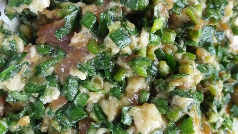 2. 拌好的韭菜猪肉馅,调料鸡蛋一次性放进去搅拌