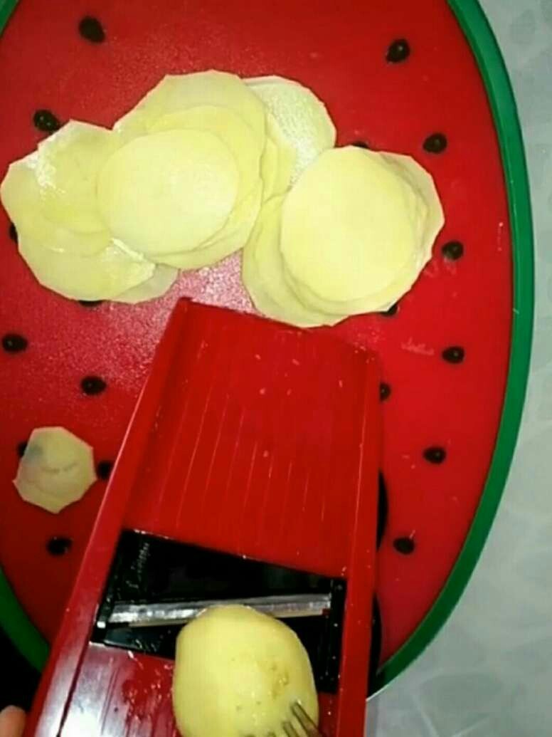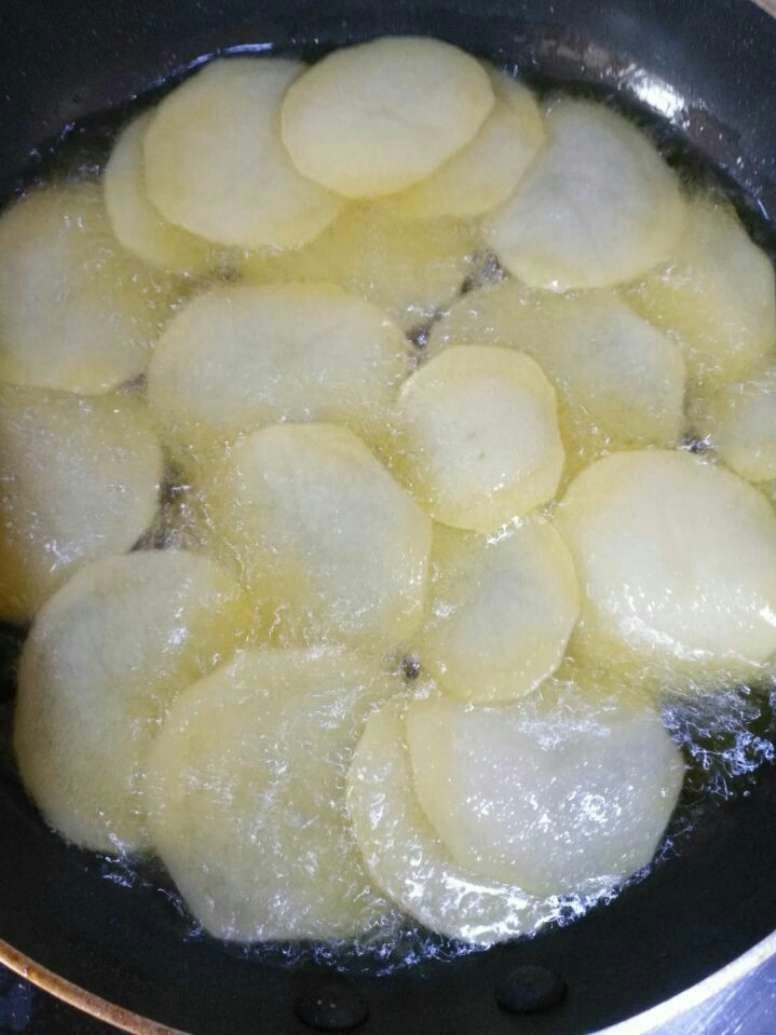 4. 去好淀粉的土豆片,放进冰箱冷藏一小时后取出,除去多余水分进行炸制