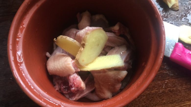 4. 把乳鸽和姜片放入炖盅里,加点料酒