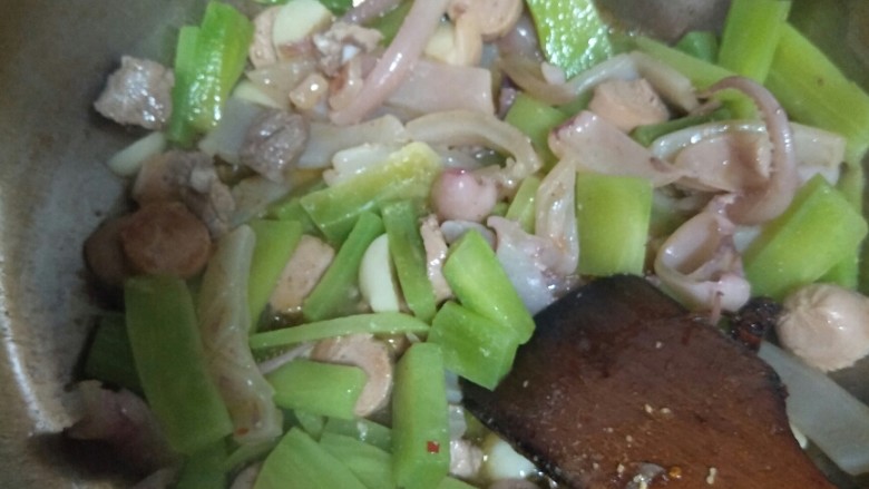5. 加入盐味,倒入三汤勺清水小火煮,八角山奈各加一颗,等莴笋耙了就加入豆粉水,收汁