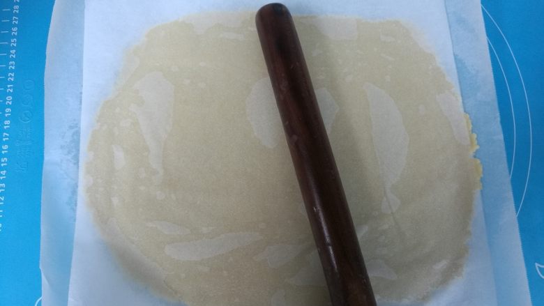 8. 上下铺上油纸,擀面杖擀成2mm厚的长方形