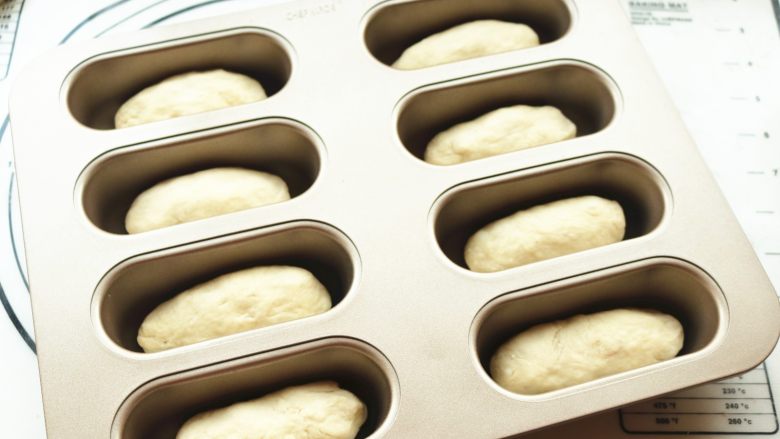 9. 每一份小面团搓圆搓长,放进学厨小热狗模具内。送入烤箱发酵档开始二次发酵,总共可以烤两盘。