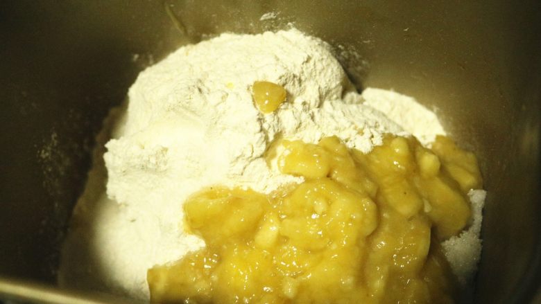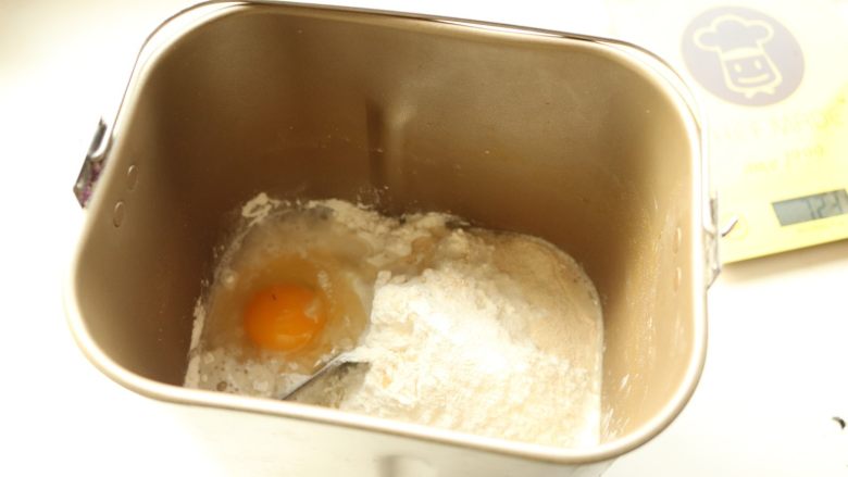 5. 主面团的材料除了黄油外放进面包桶,中种面团撕成块也放进去,面包机揉面15分钟后再放入室温软化的黄油再揉15分钟,可以拉出手套膜最佳。