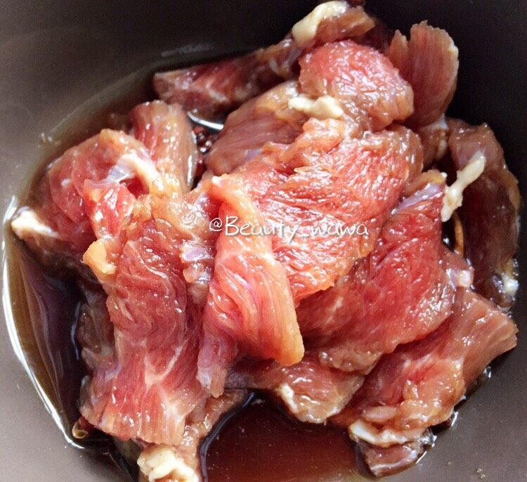 10. 如果是加入牛肉的,需要提前把牛肉切好洗净,加入盐、生抽、淀粉抓匀,腌制5-10分钟(加火腿这步可省略,直接将火腿切成长条片即可)