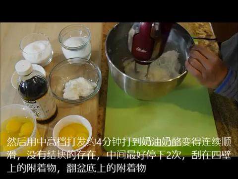 5. 把室温下软化的奶油奶酪中低档打碎,每约20秒整理附着物,继续打发,依次循环