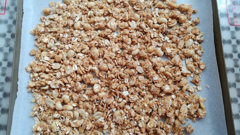 5. 把混合后的麦片倒入铺了油纸的烤盘里,预热烤箱上火130度,下火160度