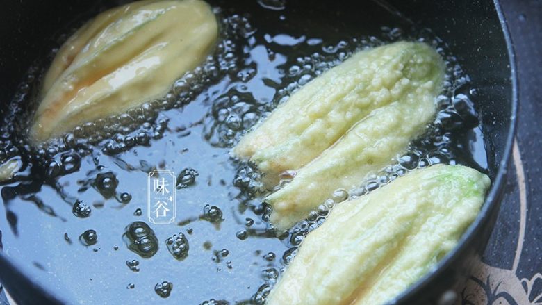 11. 锅里放油进去,煮开后把南瓜花放入锅内油炸;