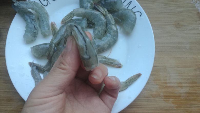 2. 明虾剪去虾枪,虾脚,去虾头、清洗干净,开背。 3、去掉纱线。